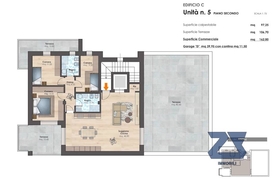 L'appartamento è così composto: ingresso, salotto in open-space che si affaccia su una terrazza di mq.80, ideale per pranzi e cene all'aperto, cucina che si affaccia sulla seconda terrazza abitabile di mq. 16, bagno e un piccolo ripostiglio. La zona giorno è molto luminosa grazie alle ampie vetrate che si affacciano sulle terrazze.